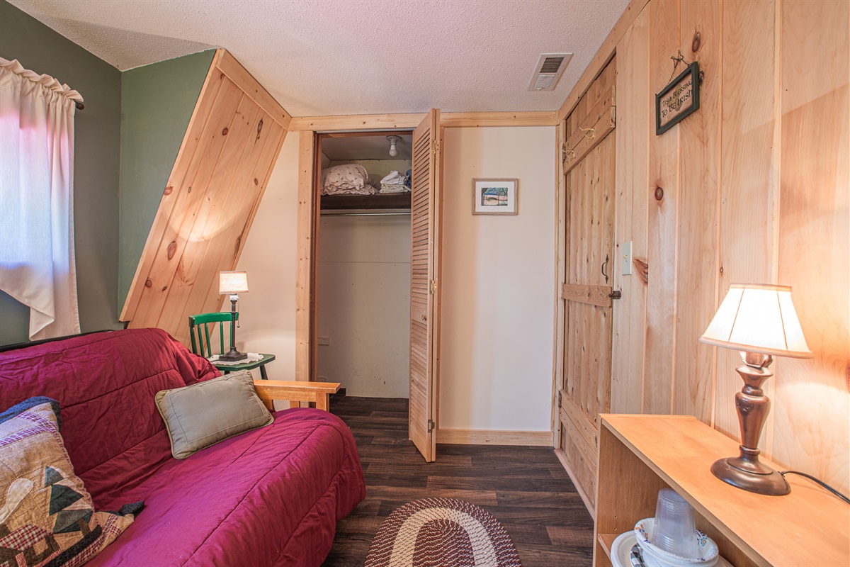 ✦ Futon Bedroom: This smaller upstairs bedroom includes a full-size pull-out futon—ideal for kids, teens, or a solo traveler. It also includes a large closet for convenience.